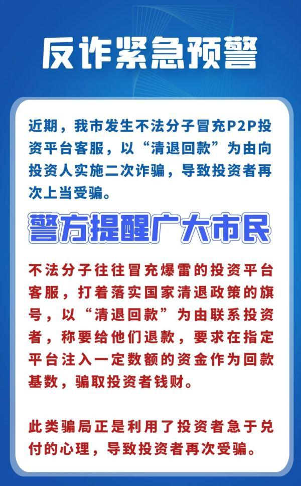 近日,全国多地警方发布预警,诈骗分子冒充P2P投资平台客服,以“清钱回来”为由,两次诈骗投资者。