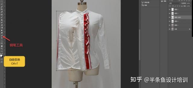 4.用【钢笔工具】挑出衬衫的左边部分,复制一个,按住【Ctrl+T】键自由变换,然后右击,选择水平翻转,向右拖动衣服。