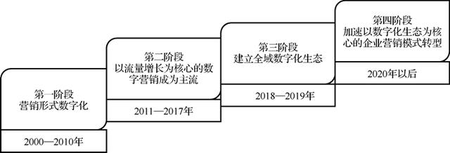 2 数字营销在中国的发展历程从理论上讲,从1997年第一代互联网技术开始,数字营销的发展序幕已经拉开,但数字营销的专业化程度已经明显提高,应该从2000年开始被企业广泛使用。从2000年到2021年,数字营销经历了四个阶段。