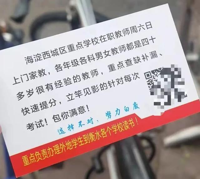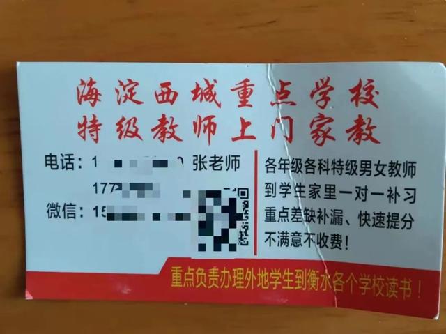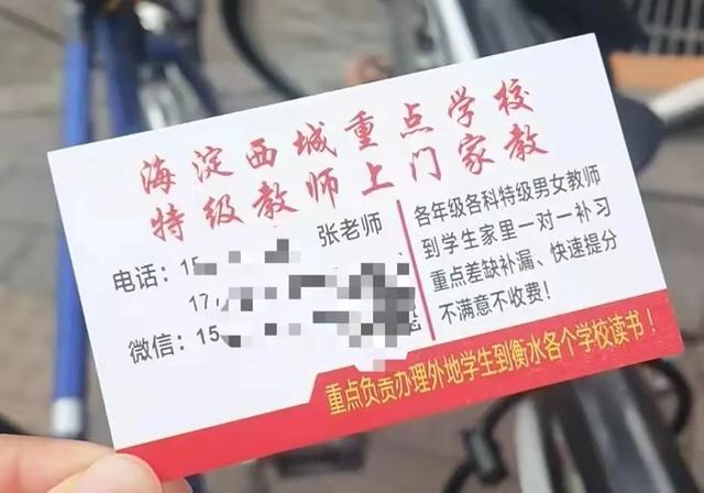 一张名片大小的卡片,上面有两行红色大字“海淀西城重点学校,特聘教师上门辅导”,底部有电话号码和微信二维码,上面写着“各年级特聘男女教师到学生家中一对一辅导,重点查漏补缺,快速计分”的字样。这种小卡片最近出现在北京西城区的一些小区和学校。李女士(华姓)告诉记者: