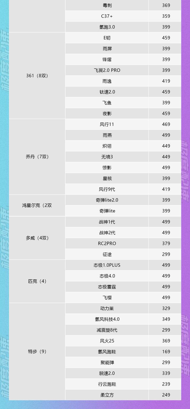 至于国内运动品牌,剔除复杂的休闲鞋和没有详细名称的鞋子后,500元以下的跑鞋数量依次为特步(9双)、李宁(7双)、安踏(8双)、361 (8双)、乔丹(7双)、红星鸿星尔克(2双)、维多(4双)、匹克。