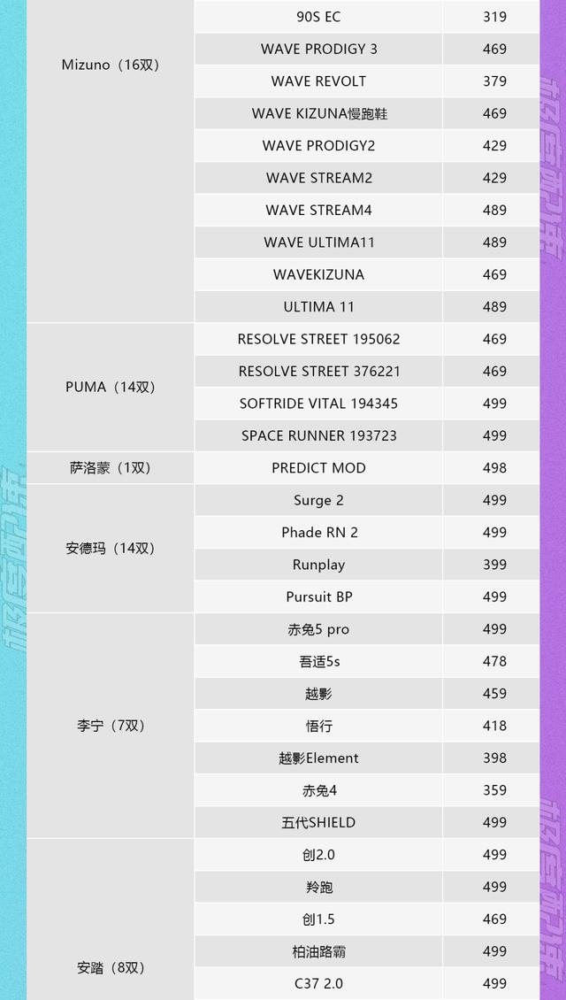 在总共九个国际运动品牌中,水野彩香以16款跑鞋领先,因为其款式众多,其次是彪马和安德玛,分别有14款,其次是阿迪达斯(8双),亚瑟士(5双),索康尼(4双)和耐克(4双)。