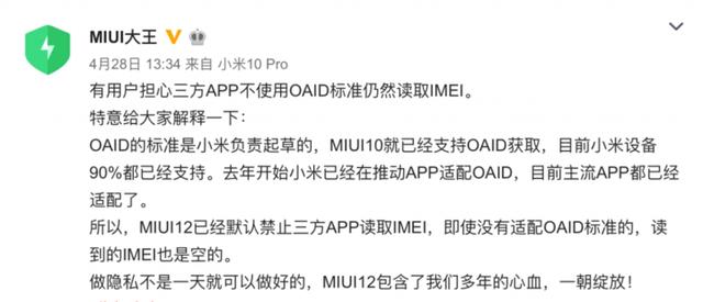 一些用户可能会担心如果应用程序不承认你的OAID标准或坚持获得IMEI怎么办。据小米互联网安全业务负责人王者微博@MIUI在微博中表示: