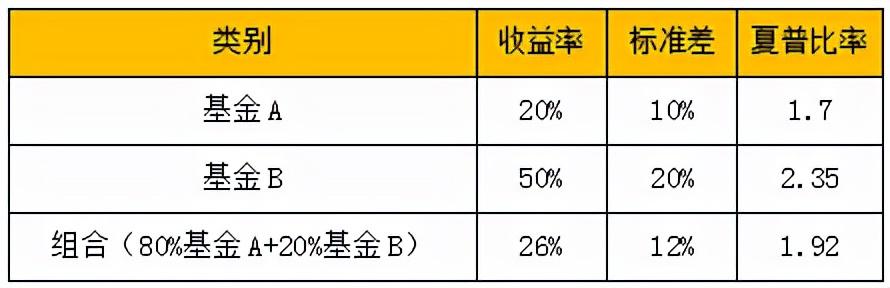 下面举个例子:之前持有基金A的收益率是20%,标准差是10%。目前有一只基金B,收益率50%,标准差20%。那么如果构建一个80%的基金A和20%的基金B的组合,之前只持有基金A的夏普比率可以从1.7大幅提升到1.92。所以我们认为纳入B可以优化我们的配置,增加单位风险下的收益。