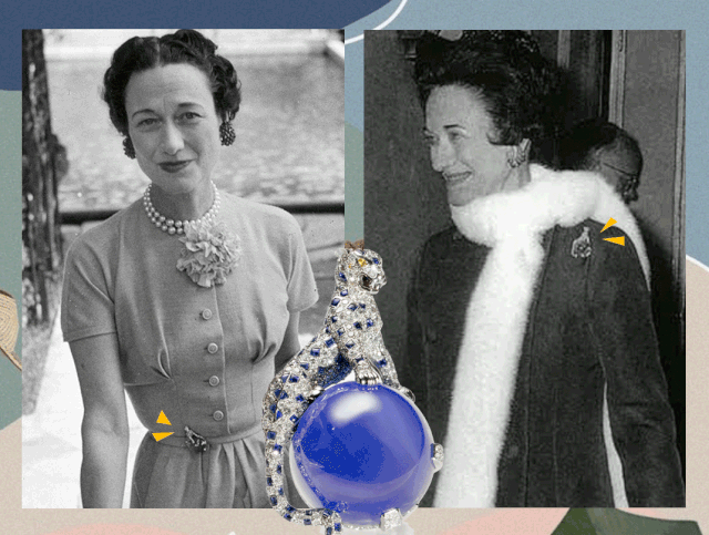 卡地亚第一次以黑白豹纹为主题的珠宝是手表,在当时瞬间走红。珍·图桑设计的最著名的卡地亚猎豹胸针,圆形蓝宝石重152.35克拉,上面站着一只骄傲的豹子,全身镶满钻石,豹子图案为蓝色。这是温莎公爵夫人的胸针。温莎公爵夫人曾送给她一个首饰盒,里面有57件卡地亚珠宝,但温莎公爵夫人最喜欢这枚猎豹胸针,它经常戴在腰间。