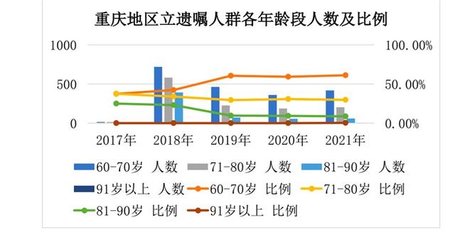 2017-2021年数据显示,重庆市立遗嘱人口主要集中在60-70岁之间,且占比逐年上升,立遗嘱人口呈现年轻化趋势。立遗嘱人的婚姻大多是已婚(单婚)。