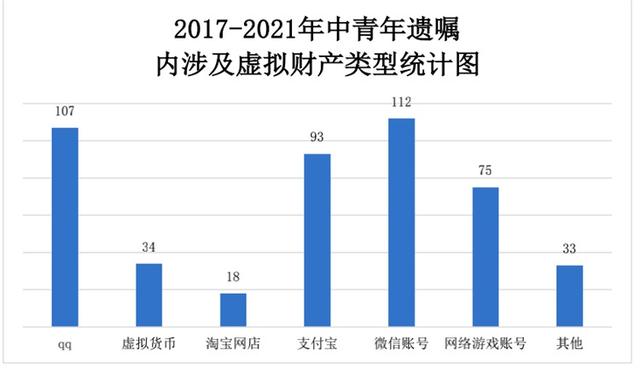 截至2021年12月31日,中国遗嘱库共收到涉及“虚拟财产”的遗嘱445份,包括QQ号、虚拟货币、淘宝、支付宝账号、微信账号、网络游戏账号等。
