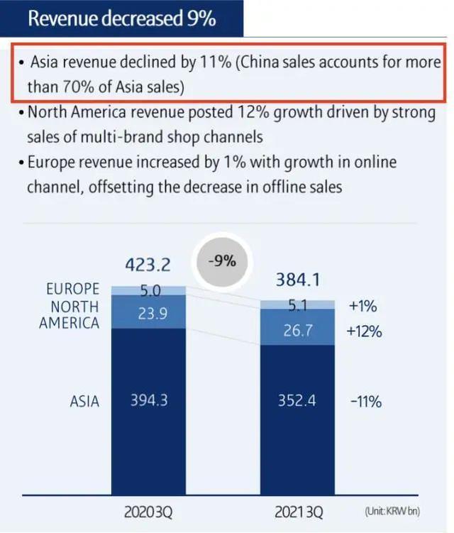 海外业务也是爱茉莉的重要收入来源之一。根据其2021年第三季度财报,海外营收为3841亿韩元,占当季总营收的34.63%。值得注意的是,亚洲地区占整体的91.74%,而中国市场贡献了超过70%的销售额。