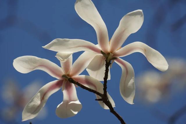 二乔广玉兰是广玉兰和广玉兰的杂交种,所以形态特征介于两者之间。先有树,先有花,后有叶。玉兰二乔的花被内部为白色,外部为淡粉色、粉红色或粉紫色。二乔玉兰有大量的园艺品种。