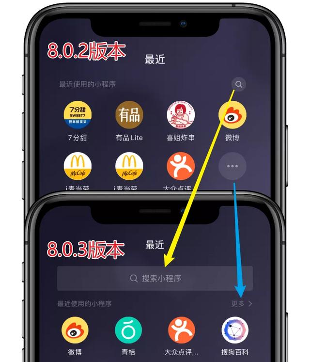 微信小程序界面“更多”不再占据单一空间,“搜索按钮”也转换成了“搜索框”。