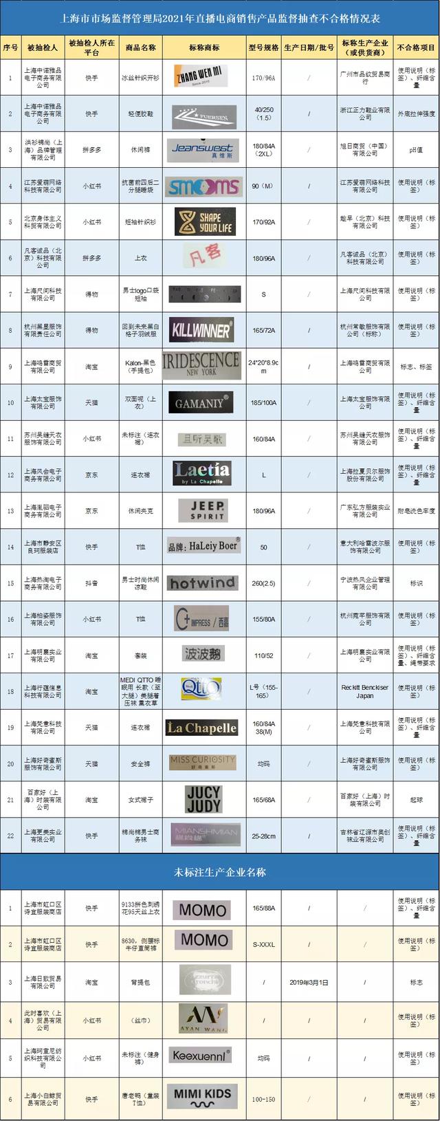 近日,上海市市场监督管理局(以下简称“上海市市场监管总局”)对爱车快消、小红书、JD.COM、吴德、淘宝、Tik Tok、拼多多等9家电商企业直播平台销售的婴幼儿服装、成人服装、服装配饰、鞋、包、床上用品等6类产品进行了抽检。