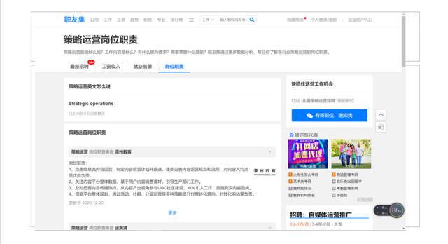 三、在线教育其他相关岗位新媒体运营:公众号、视频号、头条号、知乎、小红书、抖音、快手等知名内容平台的选题策划、内容的编辑、输出、IP方面的运营等,核心指标是粉丝量,业务方面的指标以阅读/播放、点赞、收藏、分享、评论等数据或比率。 内容运营:新媒体运营中专注内容的选题、策划、编辑、输出等,以及前端或后端团队中提供素材的岗位,比如课程、资料、海报等。 课程运营:负责课程的选题策划、内容框架、讲师沟通、内容打磨、课程上架等,会承担课程的报名人数,有的权限大的可以直接负责课程的推广运营,一般属于学科团队。短视频运营:抖音、快手、视频号、b站以及其他平台的视频内容输出,IP运营会多一些,属于新媒体运营的分支。 学科运营:负责一个教学产品线的课程、招生、活动、续报等,对产品线的招生人次负责,属于项目型运营。 招生运营:负责招生活动,设计招生策略,提供给用户增长团队/流量团队/市场团队招生抓手,设计招生活动中的转化路径,直接背招生指标。 策略运营:前端和后端团队都需要的岗位,只负责提供完整的可落地的策略方案,跟进执行,依托数据做策略迭代优化,指标以合作部门的kpi为主。 销售运营:销售团队里的策略运营。 直播运营:负责直播业务的全流程运营,包括主播选取、产品选择、剧本设计、流量推广、粉丝运营、直播间控场等,是目前在线教育的风口岗位。 转化运营:负责转化环节的策略设计,属于策略运营。 社群运营:各种类型社群的搭建、管理,sop和剧本设计、内容输出等,前端和后端部门都有相应岗位,具体职能不太相同,群的类型也不同。 活动运营:基于各种业务目的,以折腾用户为核心特征的手段,前端和后端部门都有相应岗位,有的部门直接将其变为增长。
