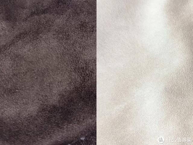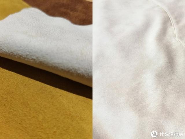 ▼左边是磨毛后的羊毛表面更加粗糙坚硬,右边是人造麂皮表面细腻柔软。