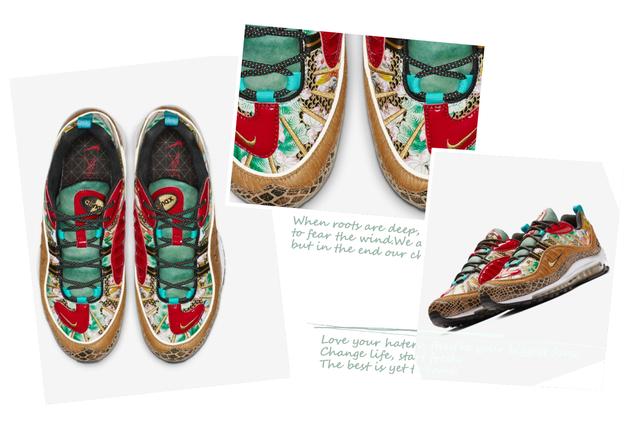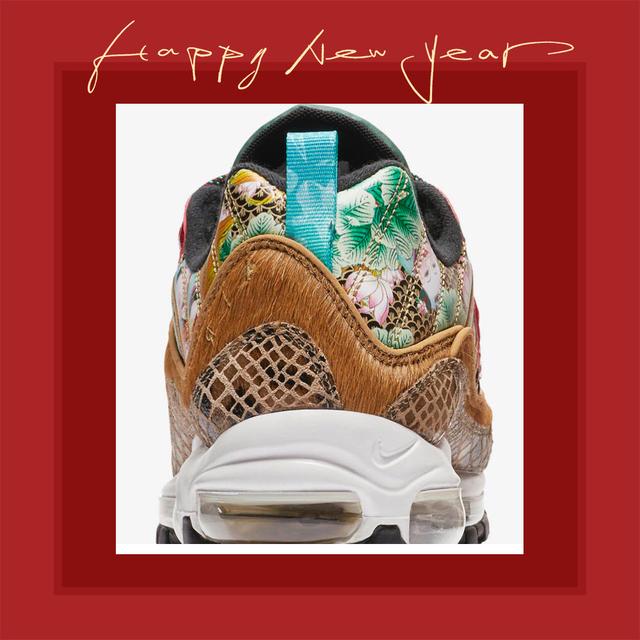 此次,特别版融入了中国十二生肖的标志性图案,以中国新年系列向猪年的到来致敬。Air Max 98从耐克“蛇年”系列中汲取设计元素,鞋面采用蛇皮图案、牛皮和莲花印花的组合。仔细看,鞋跟附近有熟悉的胖乎乎的年画娃娃!
