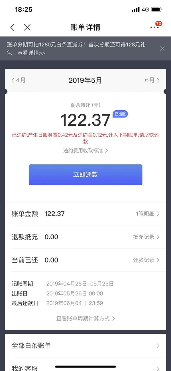 5月11日上午,张女士再次收到京东金融的还款提醒短信,显示还款日已超过7天。账户信息显示,这笔欠款的违约产生了“每日服务费0.42元,违约金0.12元”。