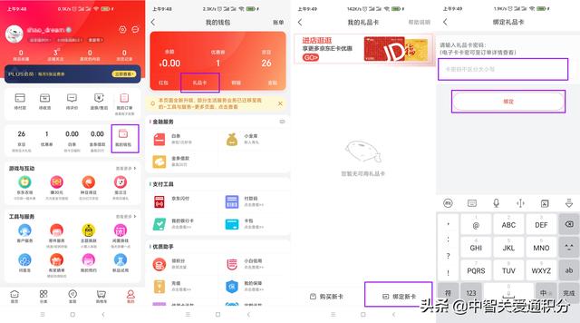 ②依次选择:我的JD。COM->:我的钱包->:礼品卡->输入要绑定的卡。
