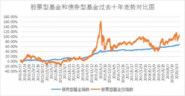 看下图。过去十年,股票型基金跌宕起伏,债券型基金平稳增长,波动不大。