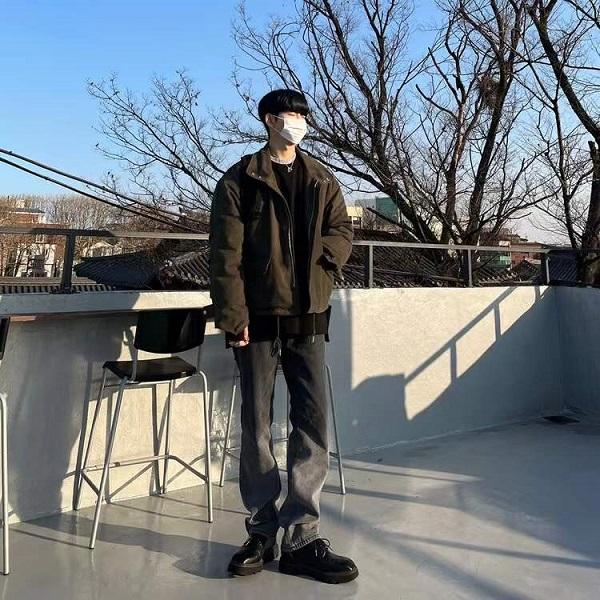 1。军绿色夹克棉袄+黑色t恤+深灰色牛仔裤