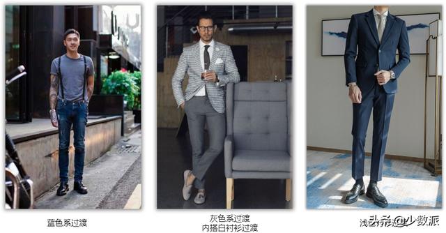 第三个原则是使用颜色过渡。颜色过渡实际上是第二法则的延伸(由浅入深的过渡)。这个原则有两个应用。一、全身一种颜色时,选择单色系的不同颜色,如浅蓝、深蓝、浅灰、深灰,或在某些部位混合一点黑白灰调和。比如西装虽然只有一种颜色,但是有衬衫和领带来调和;二、有两种以上颜色时,区分原色和次原色,用黑、白、灰或两种主色的中间色进行过渡。PS:黑、白、灰几乎是通用色。