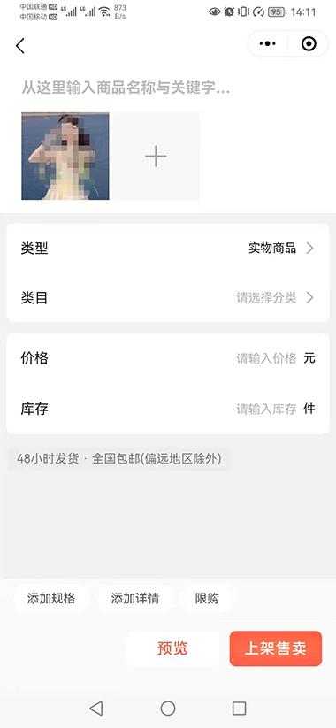 6.打开成功后,可以添加产品。点击【添加新产品】,然后填写产品类型、类别、价格、库存等信息。填好后可以先预览一下,没问题再点击【发售】。