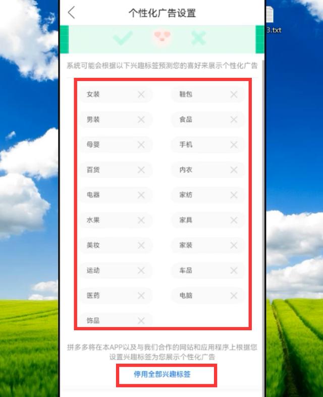 在这个界面中我们可以看到,拼多多默认为我们配置了很多个性化的广告标签,比如女装、鞋包、男装等。也就是说拼多多会不定期的给我们推荐这些个性化的广告。点击底部的“禁用所有兴趣标签”,然后在弹出的窗口中点击“确认禁用”按钮,关闭这条个性化广告。
