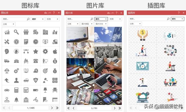 素材库:拥有案例库、主题库、插图库、图表库、图标库、颜色库、图片库、插件库等一系列PPT制作素材库。