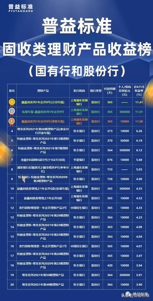 11月,在国有银行和股份制银行固定收益类产品排名中,浦发银行“鑫利系列9号(公司专属一年期)”近期6月收益率11.41%,连续排名第一;浦发银行的另外两款产品“私人银行专享-新英利系列一年期9号”和“新英利系列一年期9号(零售专享)”分别位列第二和第三。在这份榜单中,恒丰银行有11款产品,领跑这份榜单。