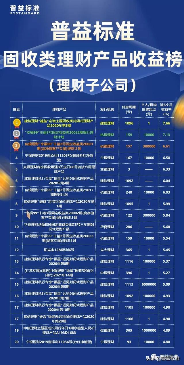 11月,在理财固定收益类产品排名中,建信理财“& # 34;成毅& # 34;主题固定收益封闭式理财产品“2020年5号”摘得桂冠,半年来收益率为7.66%。杭州理财”& # 34;幸福99 & # 34;玉3号固定收益银行2022年理财计划及& # 34;幸福99 & # 34;于3号固定收益理财计划20021期(高净值客户专属)分别位列第二、第三。本期共有8位理财经理上榜,其中建行理财经理8位,尹航理财经理5位。