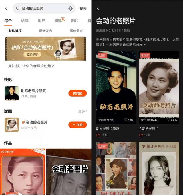 据了解,“移动老照片”是快影模板库中最新的玩法之一。用户只需在Aauto更快或快影上搜索“移动老照片”进入功能页面,选择“移动老照片”或“移动老照片”,点击开始制作按钮,上传选中的照片,即可让画面中的人“活起来”。其中“动态老照片”在“移动老照片”功能的基础上增加了相册封面入口特效。