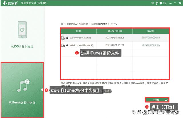 第三步:因为仅仅使用iTunes进行备份是无法查看的,所以我们需要下载数据青蛙苹果恢复专家进行下一轮的数据导出,具体步骤可以按照图片的说明来完成。