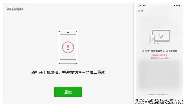 第四步:或者电脑用的网络和手机用的网络可能有出入(就像手机在电视上投屏需要同一个网络的道理)。如下图,电脑上会出现一个红色的感叹号,并有提示“请打开手机微信,连接同一网络后再试”,手机微信会提示“请保持手机和电脑在同一网络,再试一次”