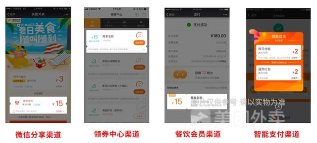店外优惠券的主要目的是帮助单量低、曝光少的商家,给商家更多的曝光机会,用更低的推广成本获得更多的流量。本次活动配置的优惠券将通过微信分享、天降红包(仅限未开通取客宝的城市)、美团优惠券中心等渠道发放给匹配的目标用户。