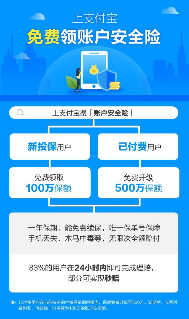 最近支付宝宣布账户安全保险不要钱了。新用户可获得100万保额,付费保额用户可免费提升额度至500万!用户原本向保险公司缴纳的保费,将全部由支付宝承担。