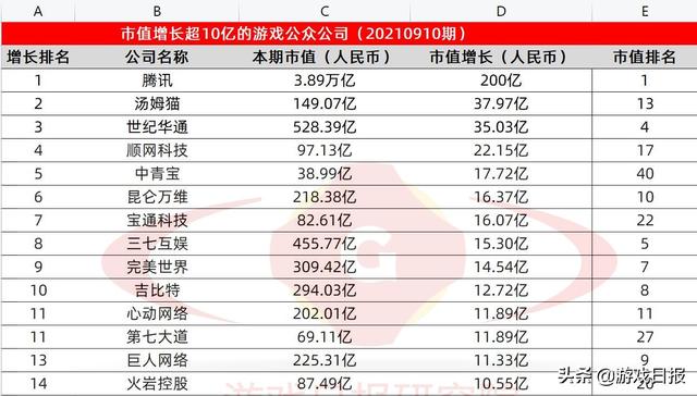 汤姆猫市值提升最多,中青宝排名提升最多