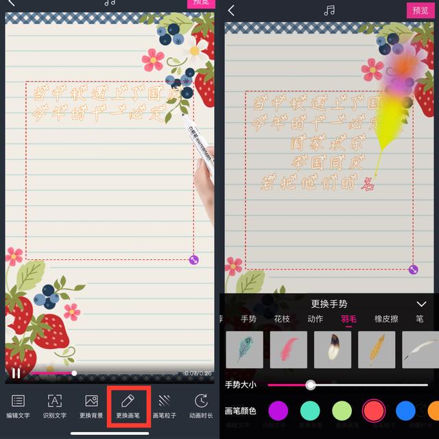 点击改变笔刷,笔刷类型有很多种,这里我选择一种羽毛笔刷,然后拖动手势大小的水平线,将手势调整到合适的大小。