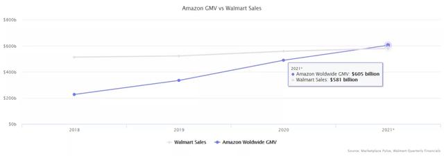 亚马逊超过沃尔玛——购物者在亚马逊上的花费超过了沃尔玛。更何况沃尔玛的销售大部分发生在线下门店,这个零售品类还是比网店大一个数量级。尽管如此,沃尔玛表示,他们的全球电子商务销售额在2021年达到750亿美元。