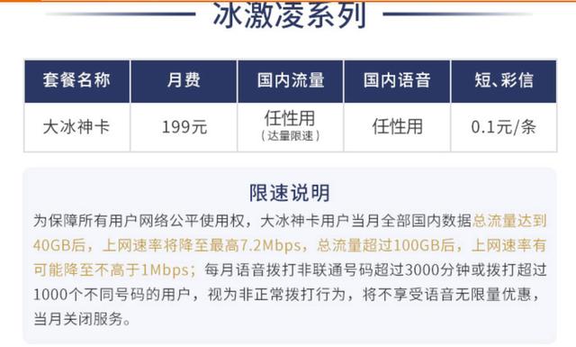 大冰卡月租199元,流量超过40G后限速,通话免费,只有一条短信,看起来还是很实惠的。如果是通话和上网比较多的用户,建议选择大冰卡。因为很多用户工作原因,每个月光话费几百元,大冰卡199元,随便用,还是很吸引人的。