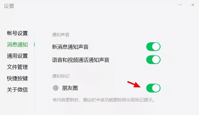 PC微信3.4.0的设置-->:消息中增加了一个“朋友圈”通知标志开关。默认情况下,此选项是打开的。关闭后,PC微信首页侧边栏的“朋友圈入口图标”上不会有小红点通知提醒。