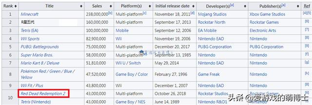 这就要提到所谓的“电子游戏历史销量排行榜”,其实之前博士也介绍过。因为时间跨度是整个电子游戏历史,所以TOP10中的产品还是比较稳定的。不过最近榜单有了一点小小的变化,那就是R星经典大作《fistful of dollars 2》进入前十,销量4300万!