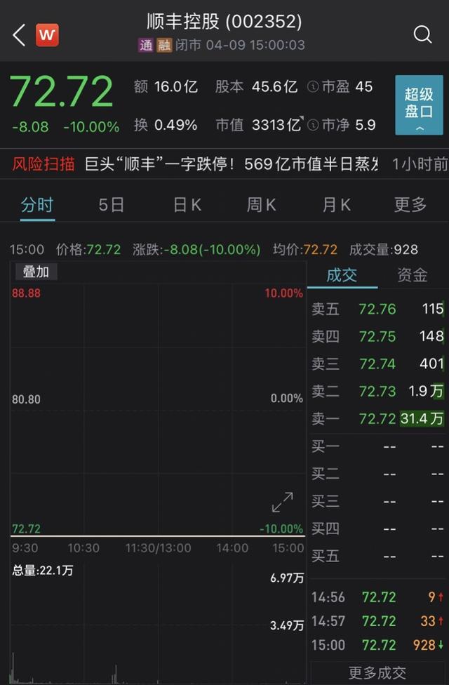 值得注意的是,这与顺丰此前年报的利润数据以及1、2月份的经营数据增长趋势形成了极大反差。短短几个月,从持续高利润增长到突然巨亏,顺丰的“急转弯”也引起了市场的强烈反应。4月9日,顺丰控股跌至72.72元/股,市值3313亿元,较去年历史高点下跌逾四成。并且“顺丰跌停”话题登上微博热搜榜。