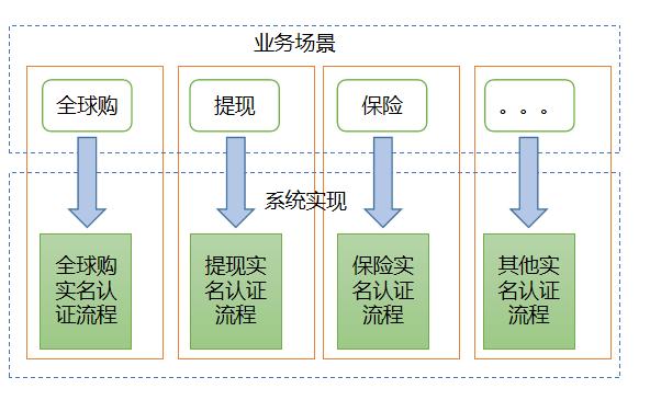 比如公司要去做跨境购业务,那么这个时候就需要实名认证,系统为当前的跨境购业务设计了一套实名认证流程;一段时间后,业务需要提现,那么这个时候,系统会针对提现场景再进行一次实名认证流程。