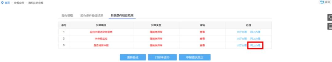 第二列是“即时条件验证结果”。异常类型分为强制和非强制两类。强制类所有未完成事项需要在申请取消前完成。