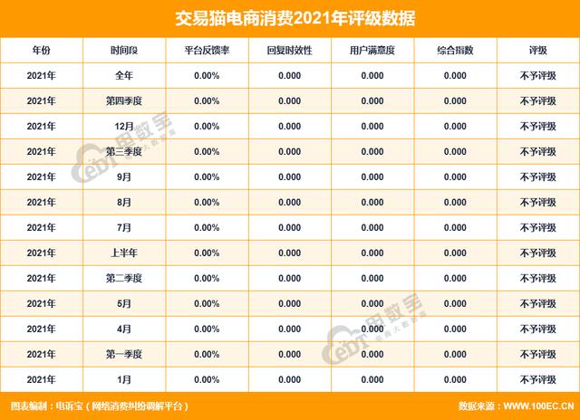 今天发布的是“交易猫”天线宝宝的消费评分数据。据“E-V-Bao”统计,2021年“交易猫”获得13个消费评分,均获得& # 34;没有评级& # 34;.