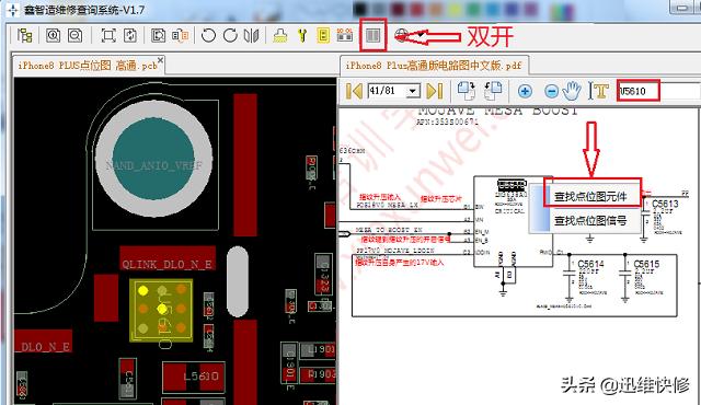 屏幕问题排除了,要么是主板问题,要么是指纹键本身损坏。根据客户描述,机器进水,拆开机器检查主板。打开新智招查询软件,点击双开,结合电路图和位图找到指纹boost IC。