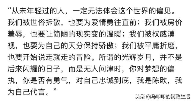 新版《陈欧提》由陈欧亲自执笔,蕴含着80后年轻一代对爱情、梦想、人生的执着追求,鼓励着正在奋力前行的人们:“即使被当局忽视,也要为自己的才华而骄傲。”这些话扣人心弦,引起了80后、90后的强烈共鸣。字字扣人心弦,句句催人泪下,鼓励无数年轻人更积极的生活!