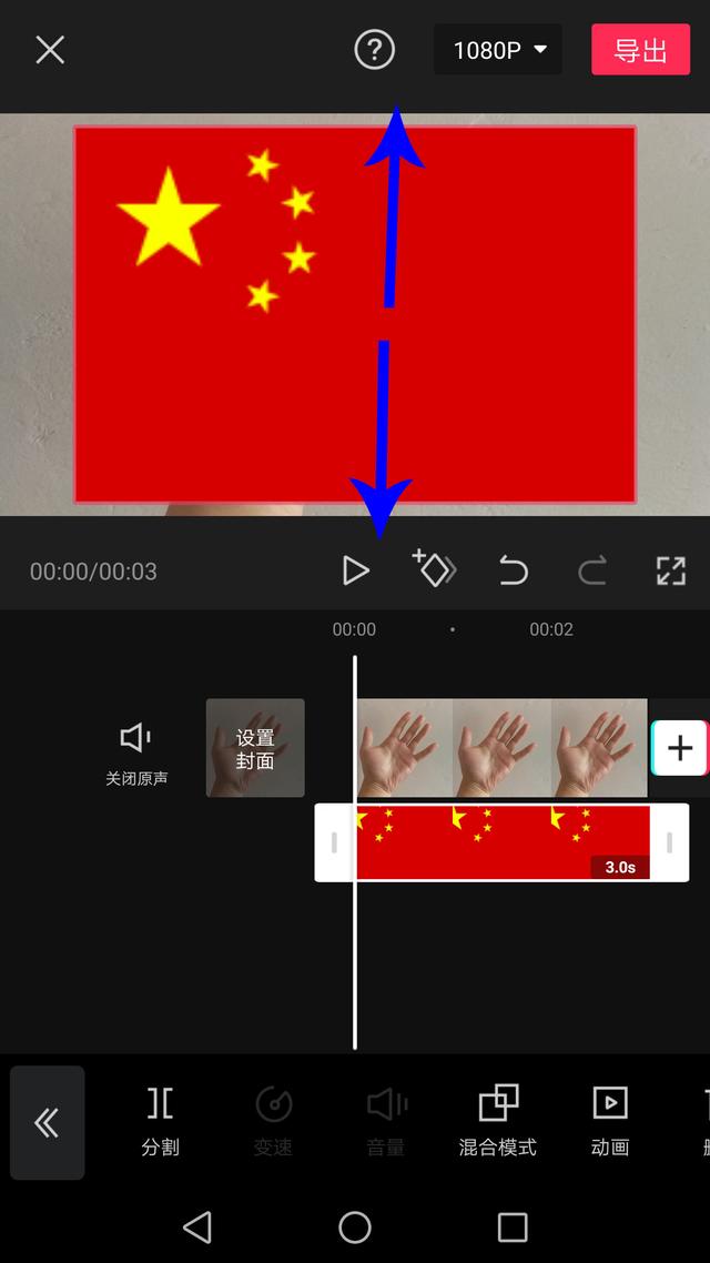 5.导入国旗照片后,用两个手指按住国旗,然后同时向两边拖动,放大国旗。然后,按住国旗并将其拖至屏幕左侧。
