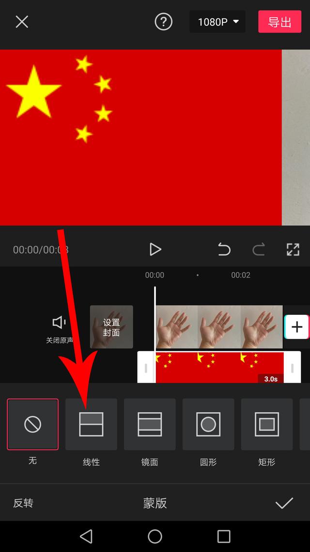 7.打开蒙版工具点击“线性”,然后用两个手指拖动屏幕中蓝色箭头指示的金线。