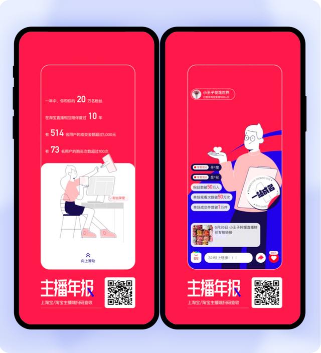 主播们讲解的产品,对粉丝说的问候,都被主播们记录下来,汇总成主播年报。它延续了产品设计中的人物形象,通过数据与图片、动画与具有直播特色的文案相结合,向主播们传递温暖,肯定他们的辛苦。