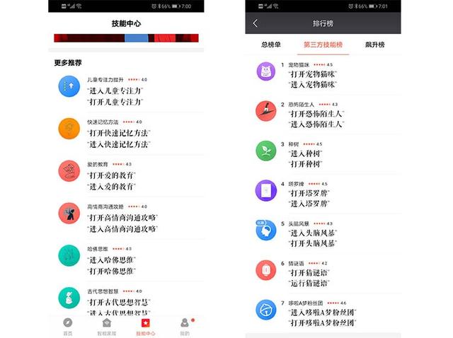 小杜在家:小杜在家的唤醒词是“小杜”,唤醒后的回应只有“这里”。语音技能主要分为四个板块,游戏、教育、休闲、工具。技能展示主要是和第三方应用挂钩,比如电子宠物、魔鬼厨房、虎牙、猜结局等等。不仅提供了排行榜供用户参考,还以列表的形式展示了自己的所有技能,方便用户筛选。