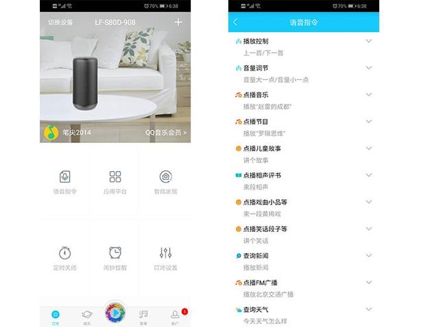我个人比较喜欢萧艾同学的网络电话功能,这也是它的一大特色。只要手机和音箱在网络环境下,手机就可以给萧艾的同学打电话(萧艾的同学不能打手机),而且它的接听和挂断功能都比较简单(按音箱上的播放/暂停,按“无麦”键就可以挂断电话),非常适合有孩子的家庭。和天猫精灵一样,萧艾学生可以播放音乐(主要和QQ音乐挂钩)、儿歌、故事、相声、书籍、电台等。在APP首页,可以作为普通音箱使用。